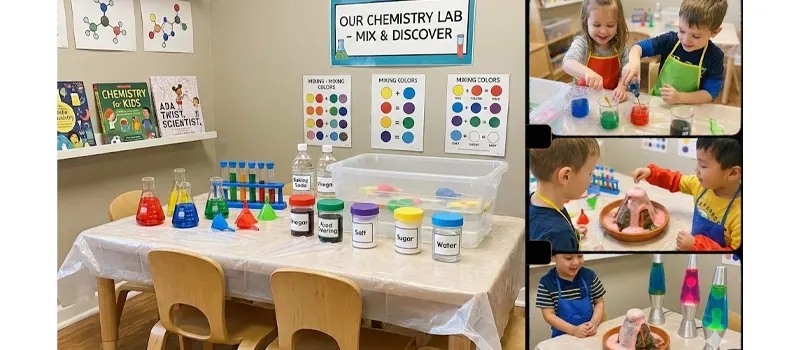 This area should be designed for simple, safe, and highly visual mixing experiments that let children explore change, reactions, and cause-and-effect. Use a low, wipeable table with clear trays or shallow bins to contain spills. Keep materials stored in labeled containers and color-code measuring tools for easy use. Include visual prompts or picture cards showing basic mixing steps and color changes. The space should feel like a mini lab while remaining age-appropriate and easy to clean.