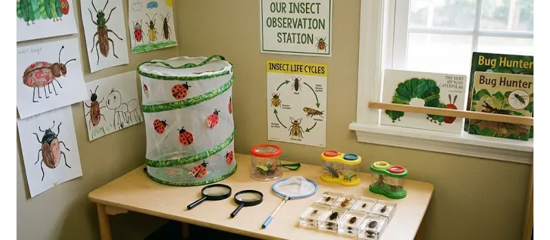 Set up this center near a window or in a quiet corner with access to natural light. Use small terrariums or clear containers to house non-harmful insects or plant cuttings that attract bugs. Surround the area with insect lifecycle posters and magnifying glasses stored on a tidy shelf. Add calming green tones or plant-themed borders to help visually anchor the space as a nature zone.