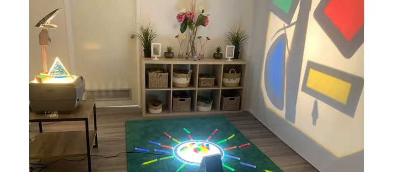 Choose a slightly dim corner of the classroom where lighting can be controlled. Use a vertical whiteboard or light-colored wall as a backdrop for shadow play. Provide adjustable desk lamps or flashlight mounts on a low table, and use translucent and opaque objects for shadow experimentation. Install soft curtains or dividers to help darken the space when needed.
