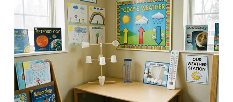 Design a cozy corner near a classroom window to serve as a weather observation hub. Use wall-mounted visuals like a daily weather tracker and a simple forecasting chart to frame the space. Provide a small shelf to organize thermometers, wind tools, and picture cards, and leave room for children to view the sky each morning. Keep surfaces dry and easy to clean, and use neutral tones or light blues to create a calm, sky-inspired feel.