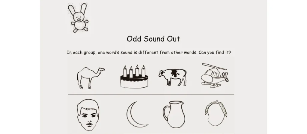 Say a group of three words and ask children to pick the one that sounds different, such as cap, cat, dog. This activity encourages attention to subtle contrasts and develops phoneme discrimination.