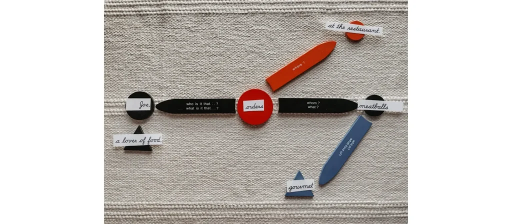 Montessori Sentence Analysis relies on simple, symbolic materials that help children make sense of sentence structure in a concrete way. These materials are not just visual aids; they guide action, discovery, and understanding through physical interaction.